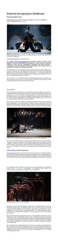 Reviewed by Miguel Schneider, Die Deutsche Buehne, Cantos is seen as setting “conditions, rather than theses”: